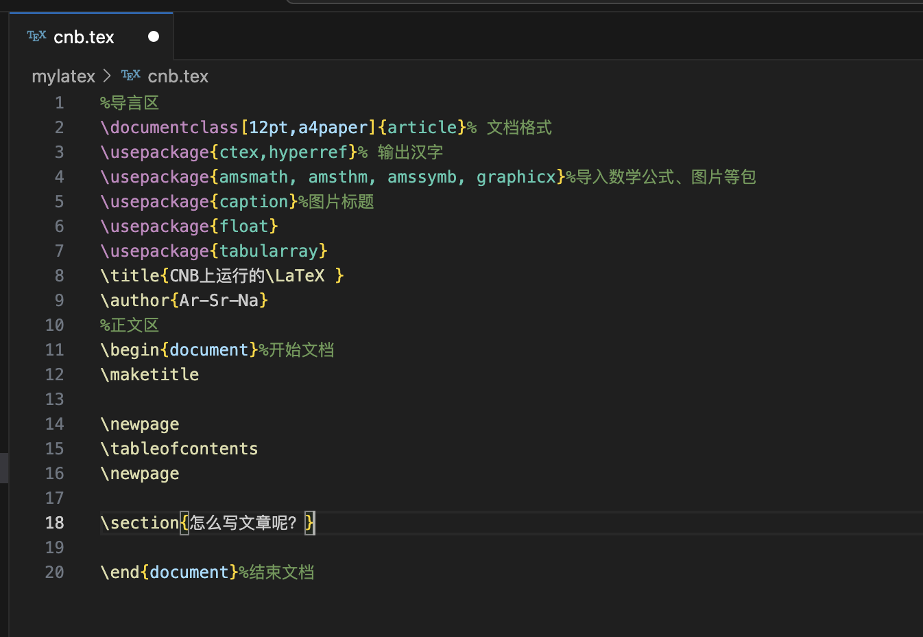 听起来高大上,但是和markdown没有什么区别,不吓唬大家了,下面就是一个latex写的简单文章: