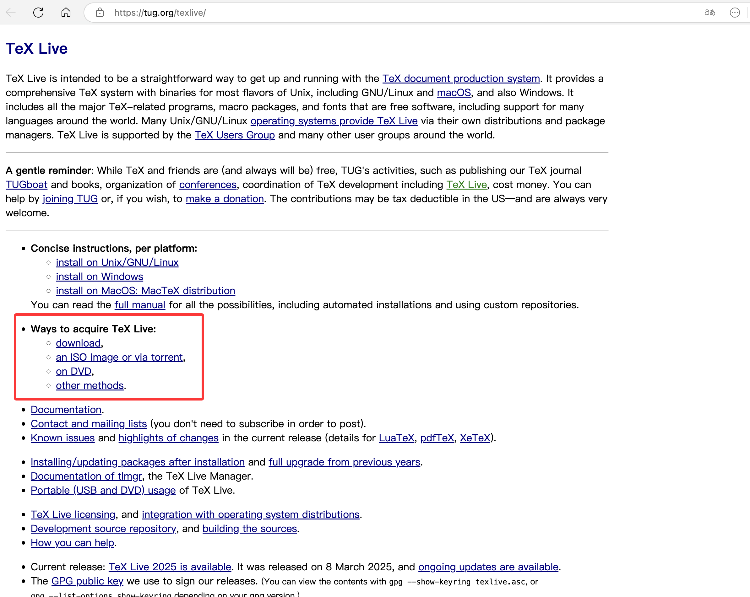 这里推荐TeXLive部署,但是再怎么推荐,最好的办法是使用CNB,所以就不过多展开,毕竟他们官网学术味太浓了,很难有看下去的欲望。简单来说就是下载安装包,安装,过程因为网络导致特别久,要支持中文和常见文章,至少需要10个GB的空间,