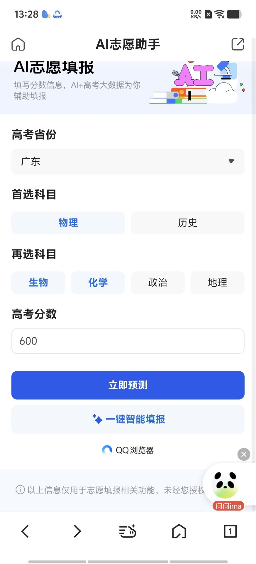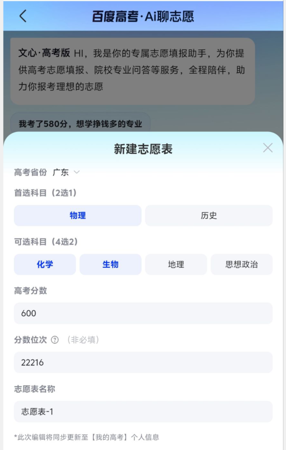 在百度网页,直接搜索“AI聊志愿”进入填写页面,它的操作也是和上面两个软件是一样的。