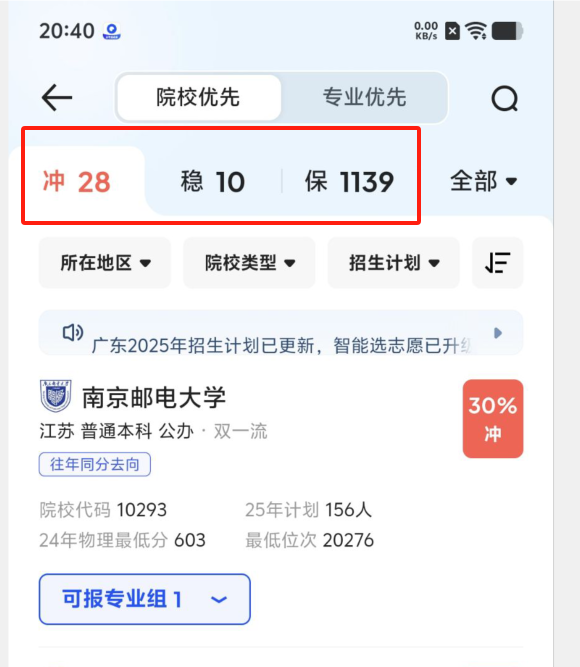 它会根据你的具体分数,计算出你目前的排名情况,然后又细分出不同的档次:可冲击、较稳妥、可保底的不同学校推荐列表。