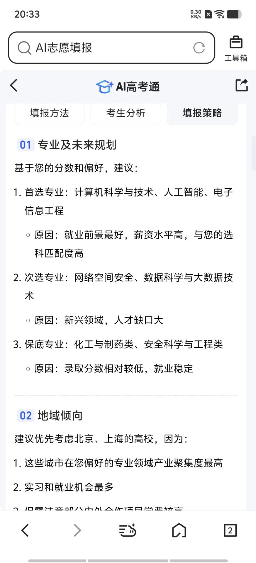 从上面几个AI软件的体验来看,QQ浏览器的“AI高考通”做得是比较完善的。它有比较显眼的分数比对,同时也能够根据你选择的志愿专业给出比较好的建议进行总结。还能够进行“全流程智能覆盖”,包含了考前冲刺辅导、考中应急服务和考后志愿填报。
