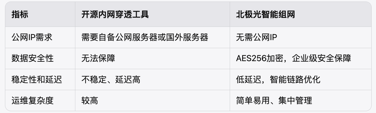 通过对比传统内网穿透方案与北极光智能组网的差异: