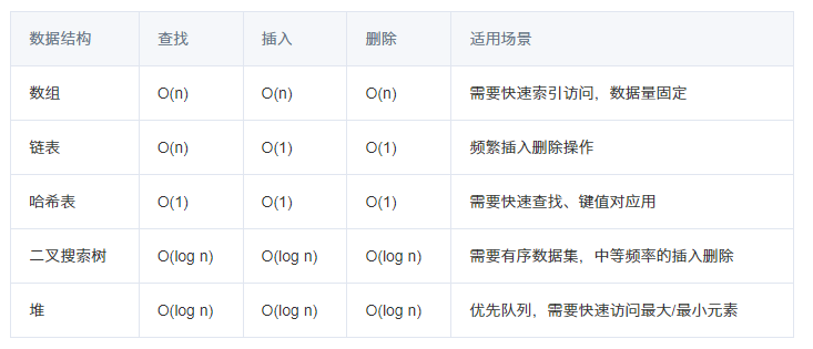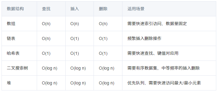 选择合适的数据结构可以事半功倍。我总结了几种常用数据结构的特点和适用场景: