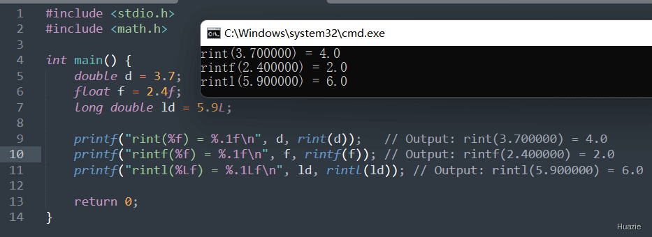 printf("rint(%f) = %.1f\n", d, rint(d)); // Output: rint(3.700000) = 4.0