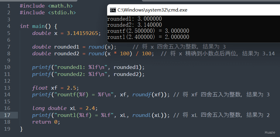 printf("rountf(%f) = %f\n", xf, roundf(xf)); // 将 xf 四舍五入为整数,结果为 3
