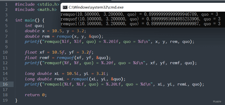 printf("remquof(%f, %f, quo) = %.20f, quo = %d\n", xf, yf, remf, quo);