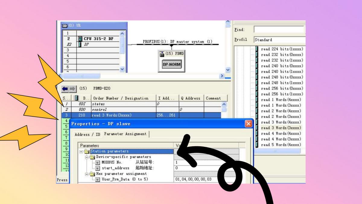 - 使用紫色Profibus DP电缆连接CPU315-2DP的X2端口与网关DP接口