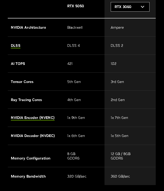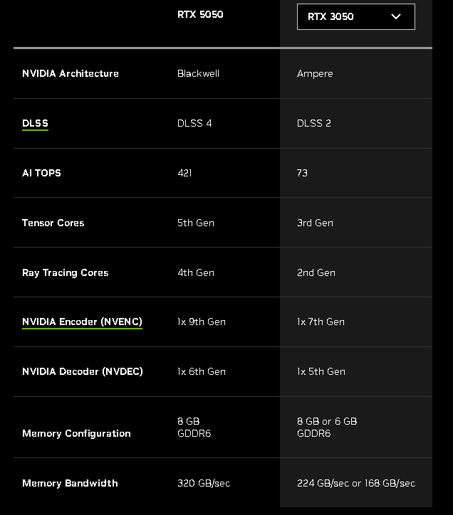 面对现代游戏对硬件性能的指数级需求,RTX 5050可为使用Pascal、Turing或Ampere架构显卡的数千万玩家带来显著提升。对比前代RTX 3050,新卡在传统光栅化游戏中平均提升60%,启用全套DLSS 4技术后性能提升达4倍;相较于Steam第四大主流显卡GTX 1650(不支持DLSS与硬件光追),性能差距进一步扩大。