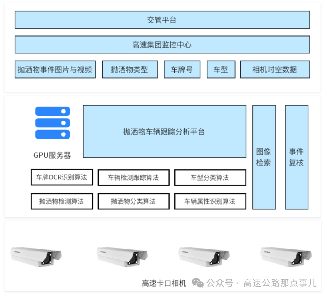 平台部署:提供一套抛洒物车辆跟踪分析平台,部署于集团监控中心或高速分公司监控中心,平台内置对应AI识别算法,支持对前端卡口相机完成抛洒物检测与车辆跟踪、检索、取证等功能;