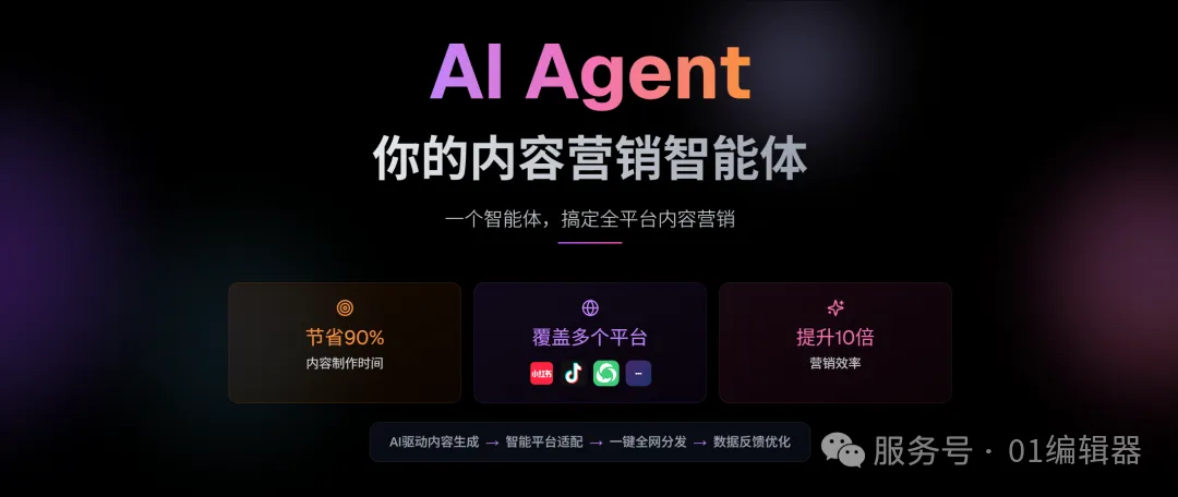 01Agent 想解决的就是让用户可以把自己的创意构思在AI的强辅助下创作出来,然后搞定多平台的内容营销,即节省90%的创作时间,提高10倍的营销效率。