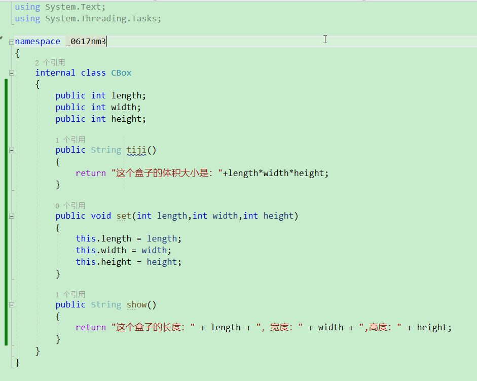 下面的这个是三个方法set和体积的计算的方法,以及打印我们的这个相关的参数的方法(使用的是字符串的拼接)都是和我们的参数相关;