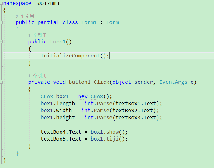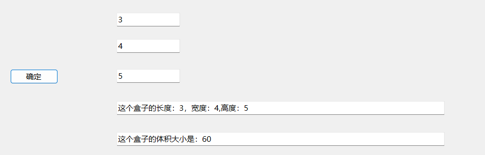 下面的这个就是我们这几天一直在打交道的,这个窗体应用程序:下面的这个案例主要是输入这个盒子的长宽高,输出这个参数的相关的信息和这个盒子的体积的大小,仅此而已,所以定义了那么几个文本框和一个按钮;