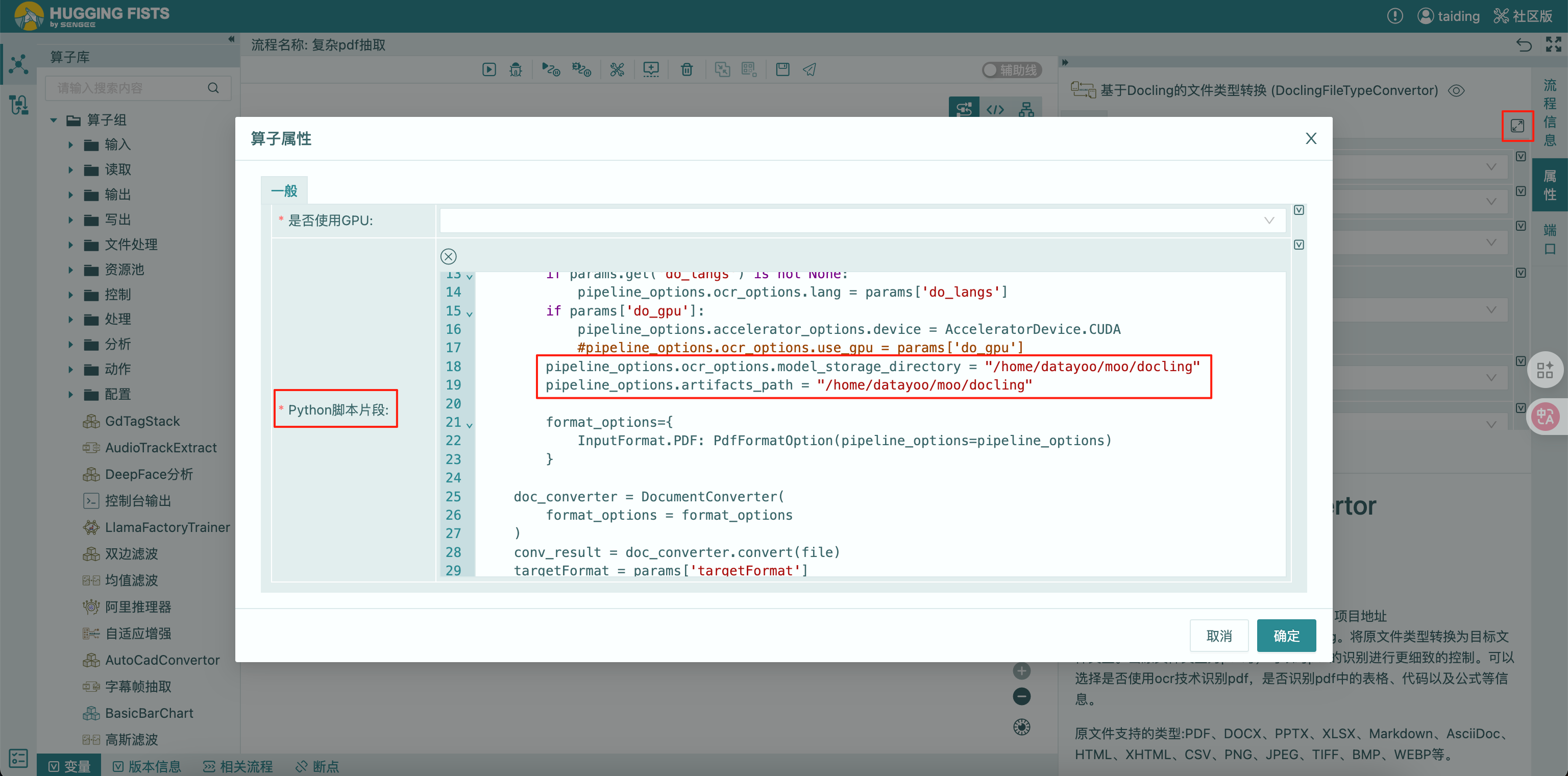 安装docling。如果你的机器能够翻墙,那么打开翻墙通道,安装完成。这里强调能够翻墙是因为docling运行时会根据算子的功能配置去下载对应的模型。而这些模型需要翻墙才能下载。需要注意的是,此时在每次使用Docling算子时,需要对算子中的Python代码部分进行相应的调整。如下图:退出oyez系统。进入sengee.community.linux/moo目录下。下载“https://pan.baidu.com/s/1uoa3UqBfHBX3sCf10bUtog?pwd=1234”的包到当前目录,解压Docling.zip包。该包中包含Docling运行所需的部分模型。对于无法翻墙的用户,运行时无法下载到对应模型。故而无法正常运行Docling。HuggingFists提供的这个压缩包中涵盖了ocr识别,布局识别以及表格识别等多个模型。可以帮助网络条件不足的朋友使用Docling算子。需要注意的是,当前提供的模型中,未包括代码识别和公式识别的模型,如需此类功能需下载对应的模型放在指定的路径下。