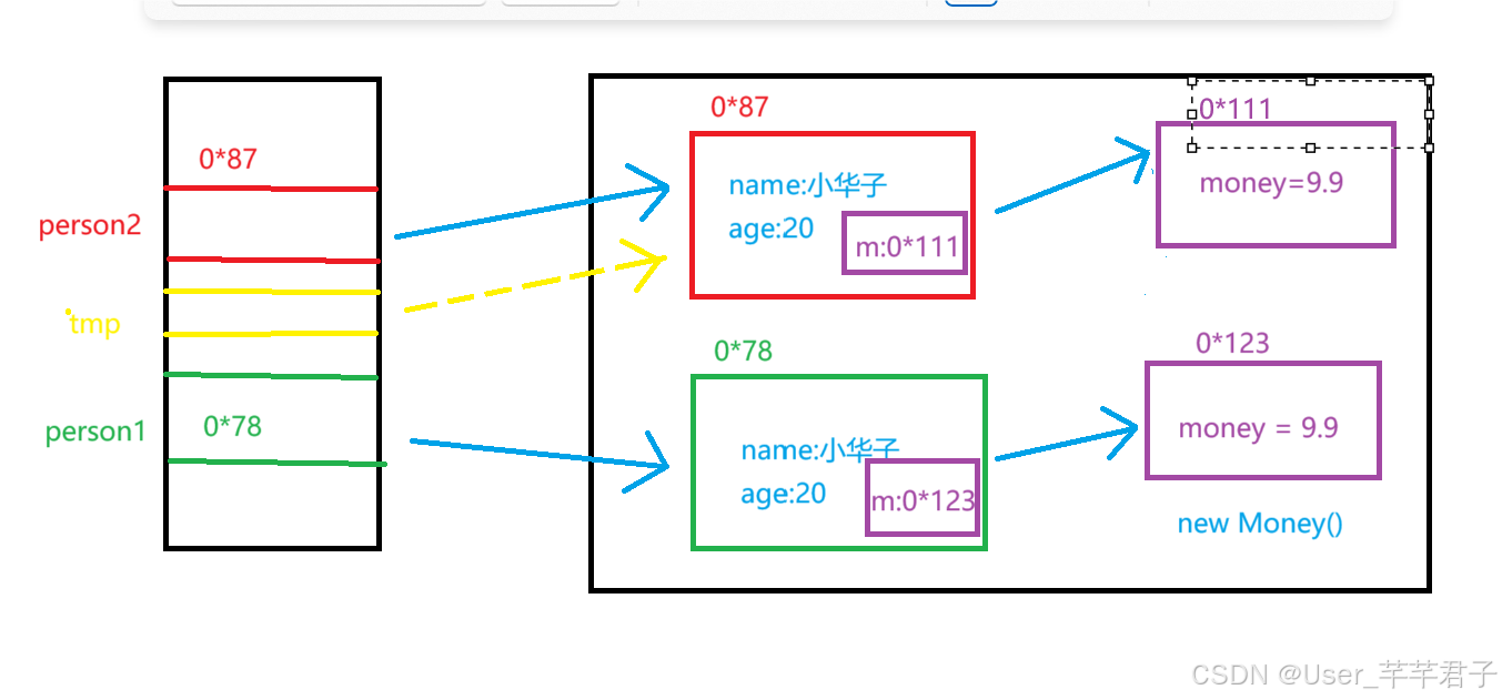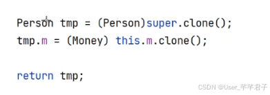 通过clone,我们只是拷⻉了Person对象。但是Person对象中的Money对象,并没有拷⻉。通过person2这个引⽤修改了m的值后,person1这个引⽤访问m的时候,值也发⽣了改变。这⾥就是发⽣了浅拷⻉。