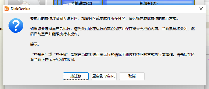 第四步:选择迁移系统的执行方式。这里可以先选“热迁移”,这样就不用重启电脑的情况下完成任务。