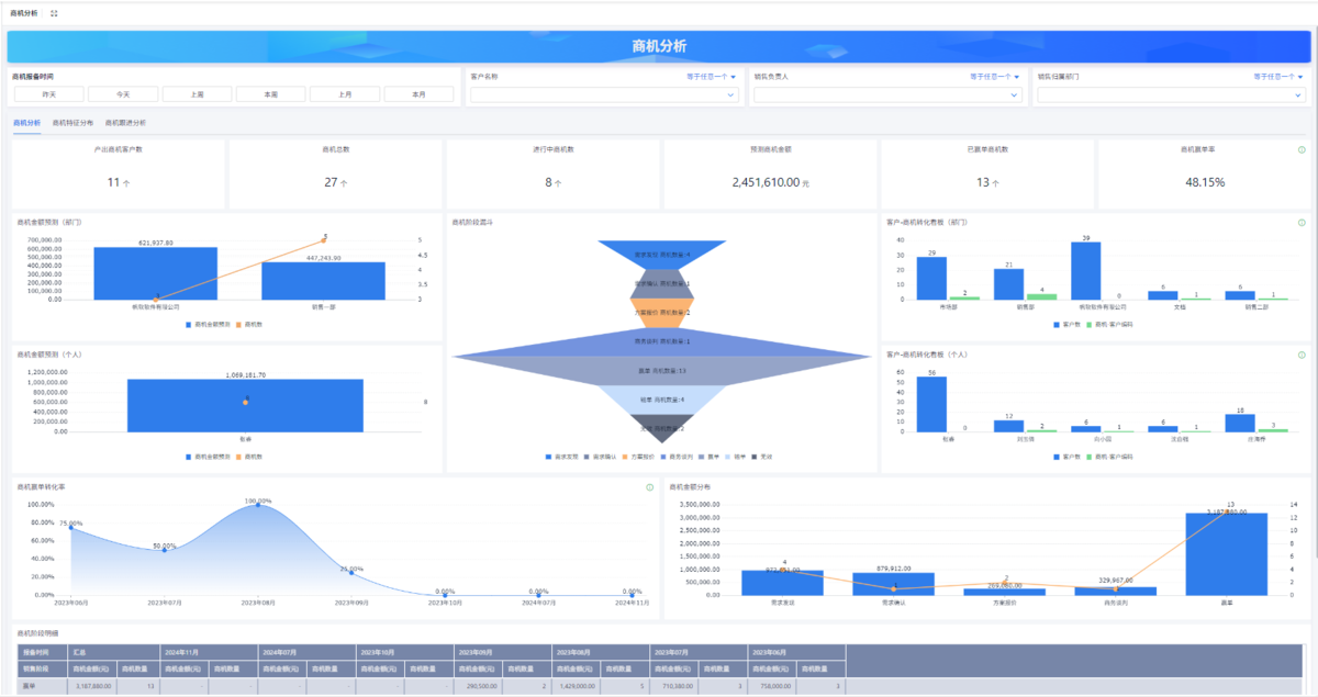 商机管理的关键KPI包括:商机的转化率、每个销售阶段的平均处理时间、商机的预计收入、销售人员的成交率等。这些指标能够帮助企业评估销售团队的绩效,识别潜在的改进空间。