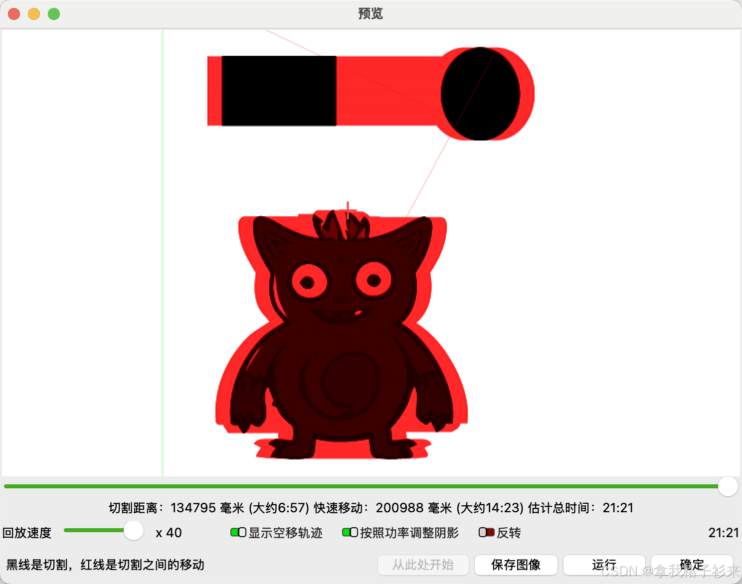可以设置速度,运行,是否显示空轨迹,保存图像。 黑色为切割,红线为机器空走的轨迹。