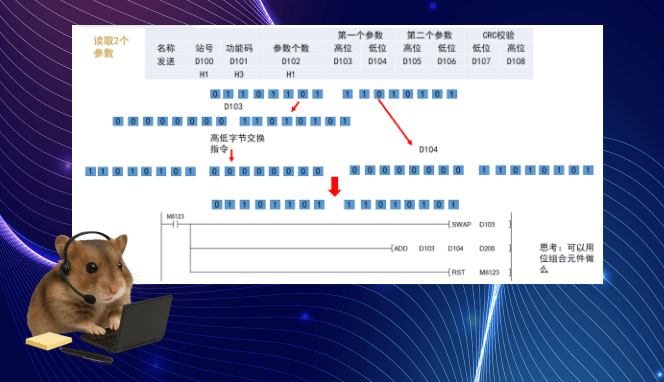 通讯完成后M8123会自动导通,此时需要对读取回来的数据进行处理,最后复位M8123.读取回来的数据是8位的,会保存到2个寄存器的第8位, 需要通过SWAP和加法指令进行还原,才能显示为正常的数据。