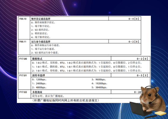 接下来是通讯参数的设置,变频器侧,F00.10需要设置为02,F00.11设置为02,这样变频器的控制就由通讯所控制;