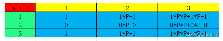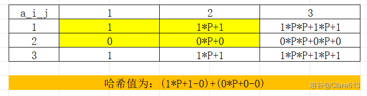 很明显,虽然一整个矩阵哈希值不好求小矩阵的哈希值,但我们可以对于每一行来求一次,使得每一行都为单独的一个,经过计算可以得到如下的 a_{i,j} 的表格:\