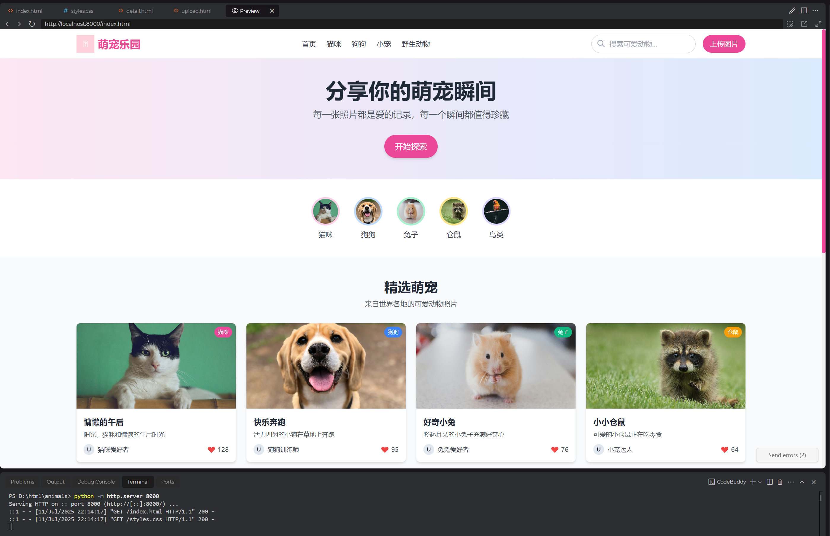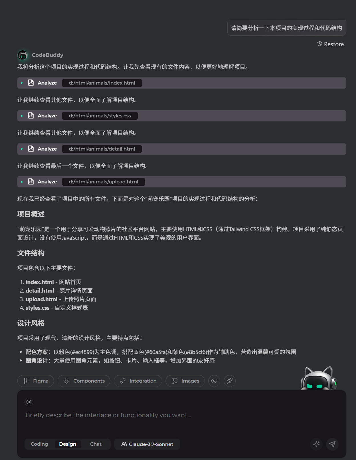 需求是能展示和分析可爱动物的主题图片。细节我没太想好,不过我也懒得想,正好测试一下CodeBuddy IDE的设计能力。
