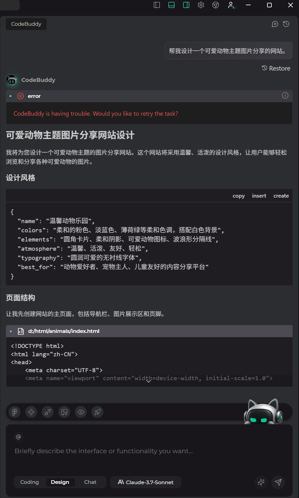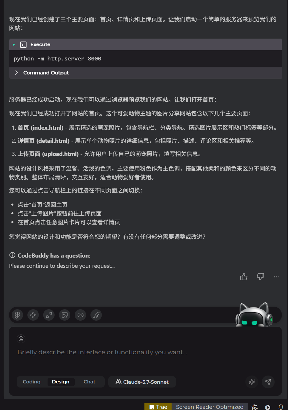 我跟它对话直接一句话提出我的要求:请它帮我设计一个萌宠网站。
