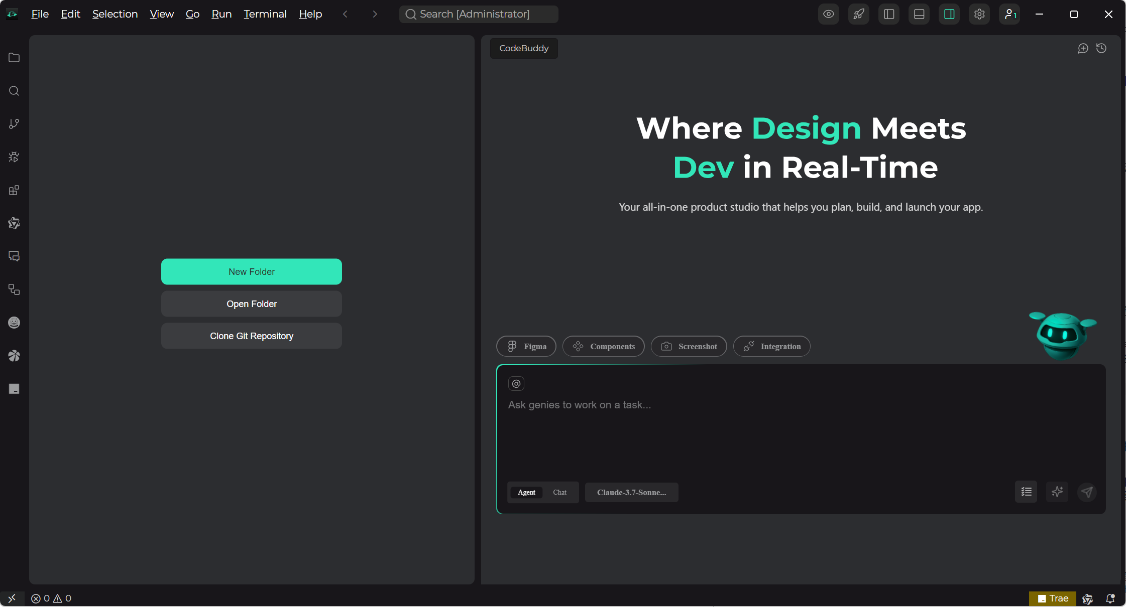 可以进入到IDE的主界面了。可以看到界面非常的美观丝滑,布局合理,最上方是命令导航栏,左侧是工具栏和管理工作区,右侧是Codebuddy的AI智能体对话框区域,符合我的常用习惯。