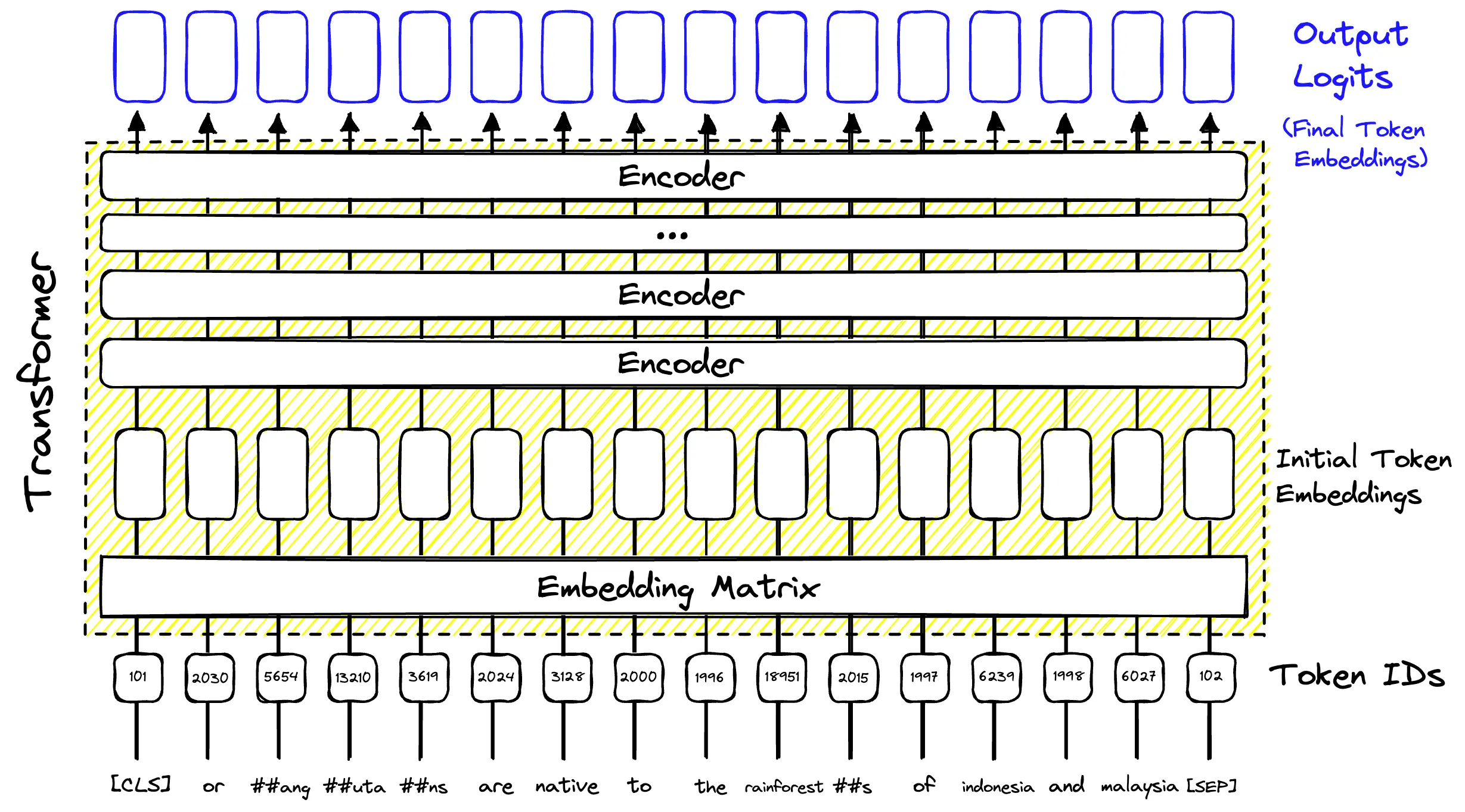 BERT 是一种流行的 Transformer 模型。与所有 Transformer 一样,其核心功能是生成信息丰富的词元嵌入(Token Embeddings)。这具体意味着什么呢?