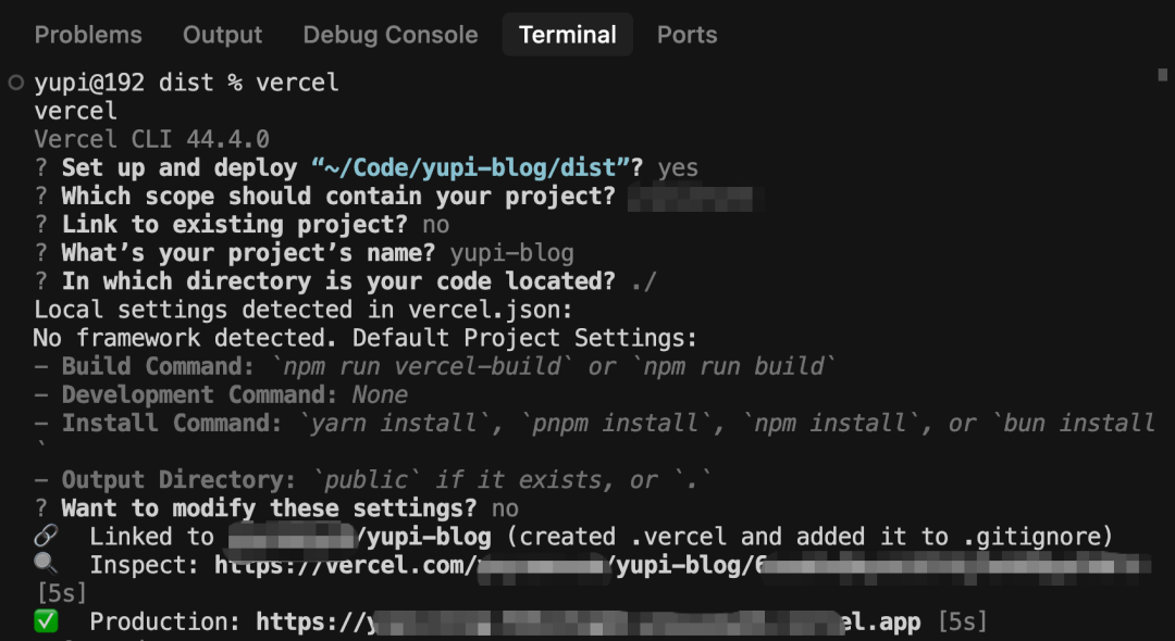 然后,直接在想部署的项目文件夹下输入 vercel 命令,就能部署当前项目了: