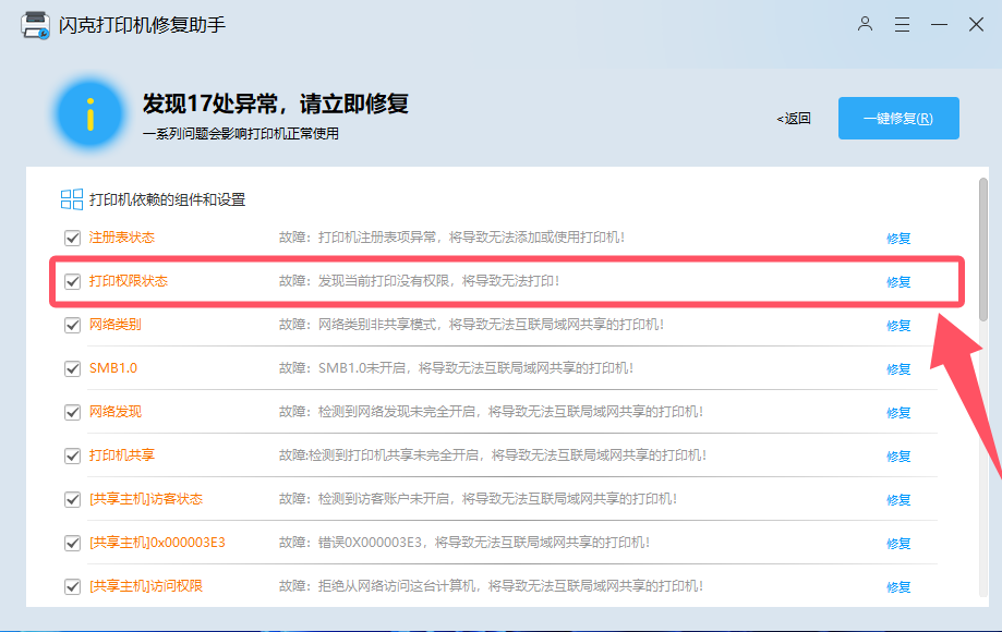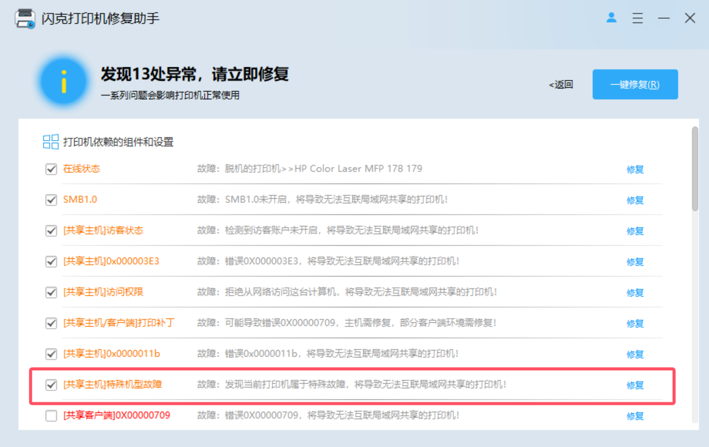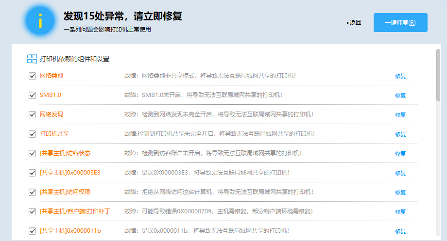只综合修复功能能将错误修复与打印机驱动的功能整合为一个综合修复功能,不仅能够扫描出打印机依赖的组件和设置问题,还能扫描对应的驱动。