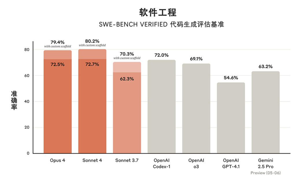 MCP 就是 Claude(Anthropic) 主导发布的一个开放的、通用的、有共识的协议标准,如果我们对 AI 模型熟悉,想必对 Anthropic 这个公司不会陌生,2025.5.22他们发布了 Claude Sonnet 4、Claude Opus 4 的模型(更精准地执行指令、且在“记忆”能力上实现提升,在需要持续专注且涉及数千步骤的长期任务中保持稳定性能),到目前为止应该还是最强的编程 AI 模型。在一项对比不同大型语言模型软件工程任务表现的基准测试中,Anthropic的两款模型击败了OpenAI的最新模型,而谷歌的最佳模型则表现落后。