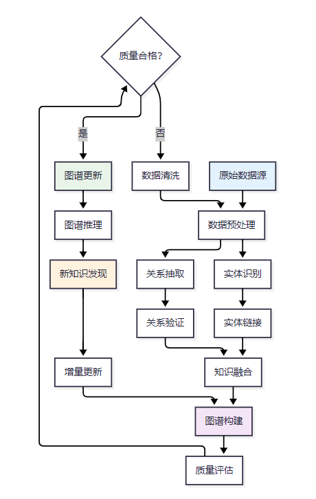 知识图谱通过结构化的方式组织和表示知识实体及其关系,支持复杂的推理和查询。其构建过程包括: