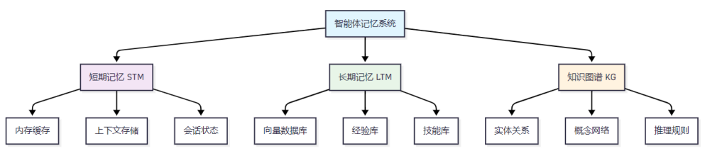 智能体的记忆系统主要包括短期记忆、长期记忆和知识图谱三个层次。短期记忆用于存储当前会话或任务的上下文信息,长期记忆用于保存长期积累的知识和经验,而知识图谱则通过结构化的方式组织和表示知识实体及其关系。
