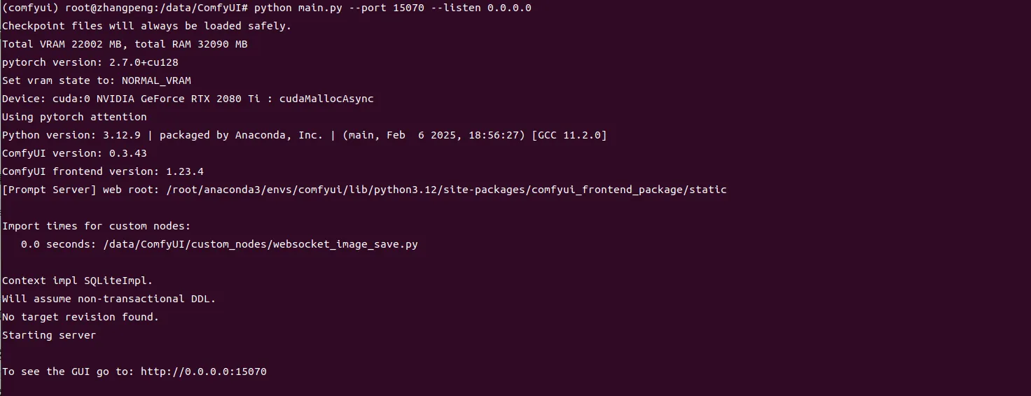 进入ComfyUI目录,执行如下启动命令,等待comfyui启动: