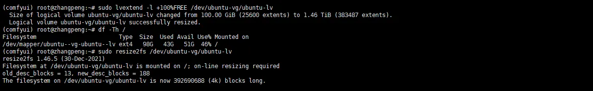 将卷组ubuntu-vg(VG)中所有剩余空间(+100%FREE)分配给名为ubuntu-lv的逻辑卷(LV),并使用resize2fs 命令调整文件系统以匹配新容量: