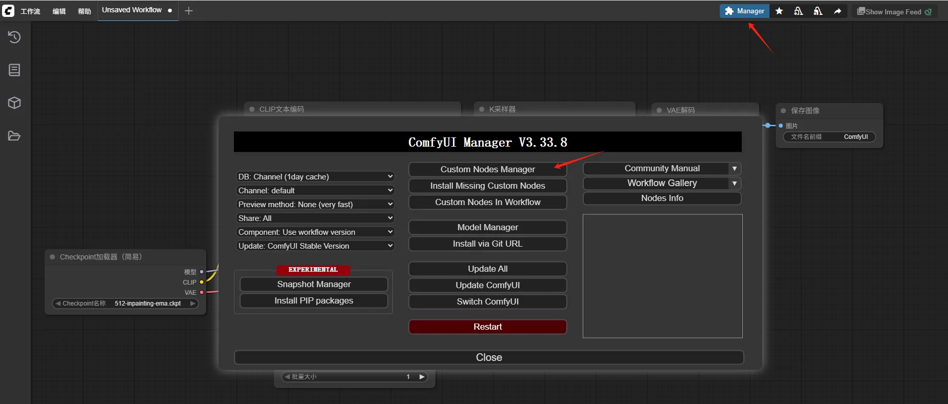 通过浏览器访问comfyui,主要看ComfyUI-Manager这个插件,后续的插件模型可以通过这里去下载: