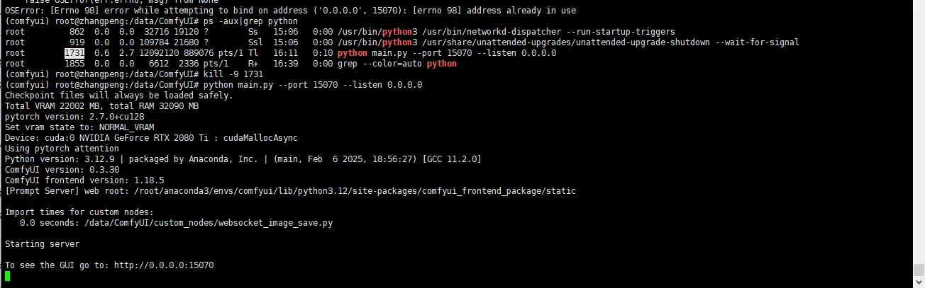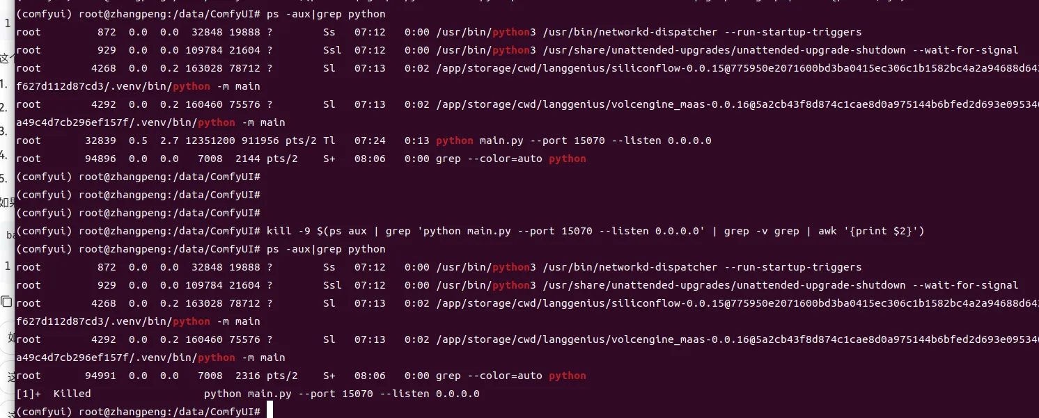 kill掉comfyui进程 ,重启comfyui程序: