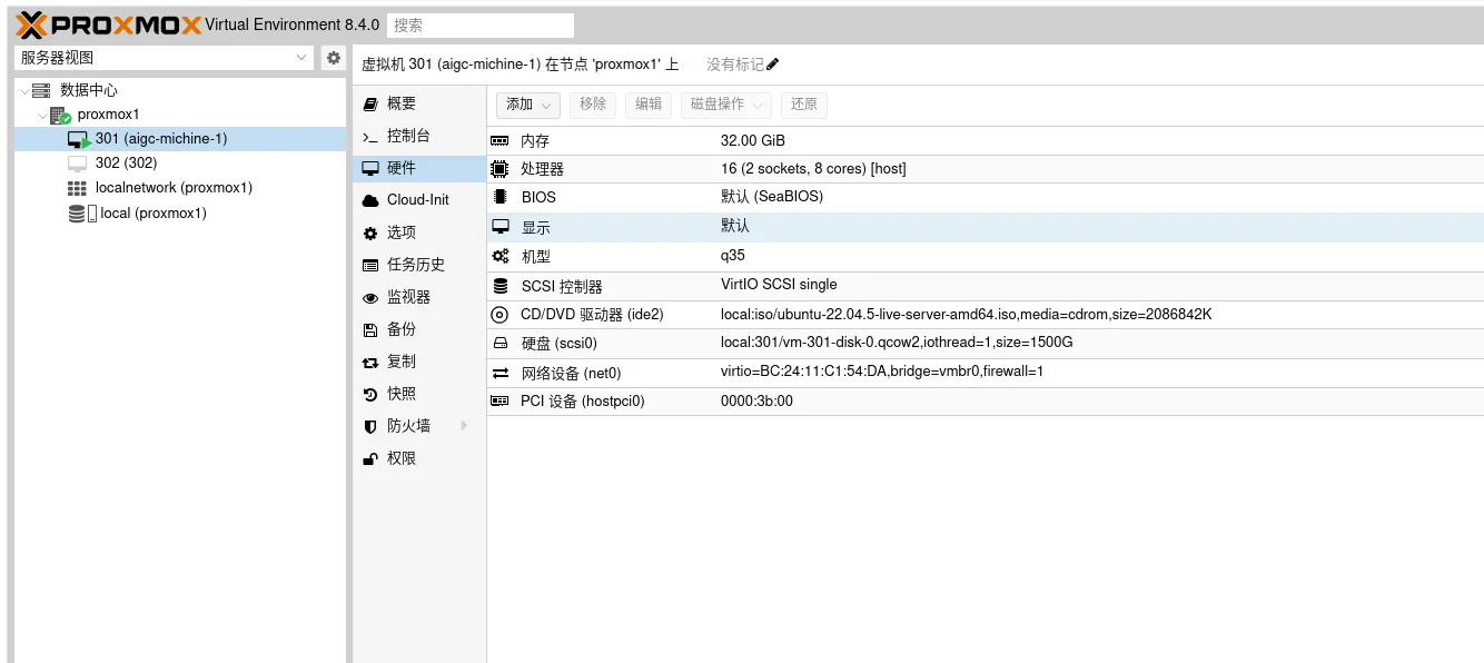 戴尔R740服务器,安装了proxmox操作系统,配置了显卡直通。创建了一个ubuntu 22.04 VM虚拟机实例,并安装了显卡驱动与cuda等相关配置: