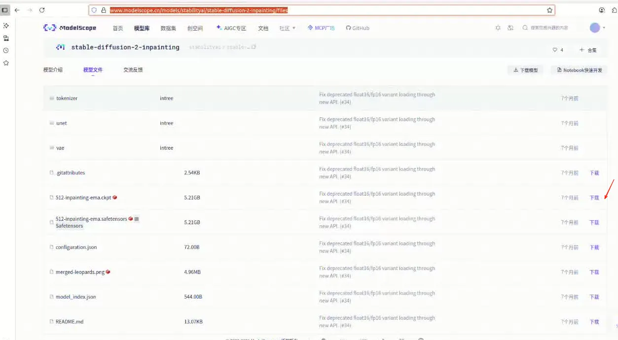 通过该社区这里下载了模型:https://www.modelscope.cn/models/stabilityai/stable-diffusion-2-inpainting/files(否则就要通过科学上网,这里就偷懒了)