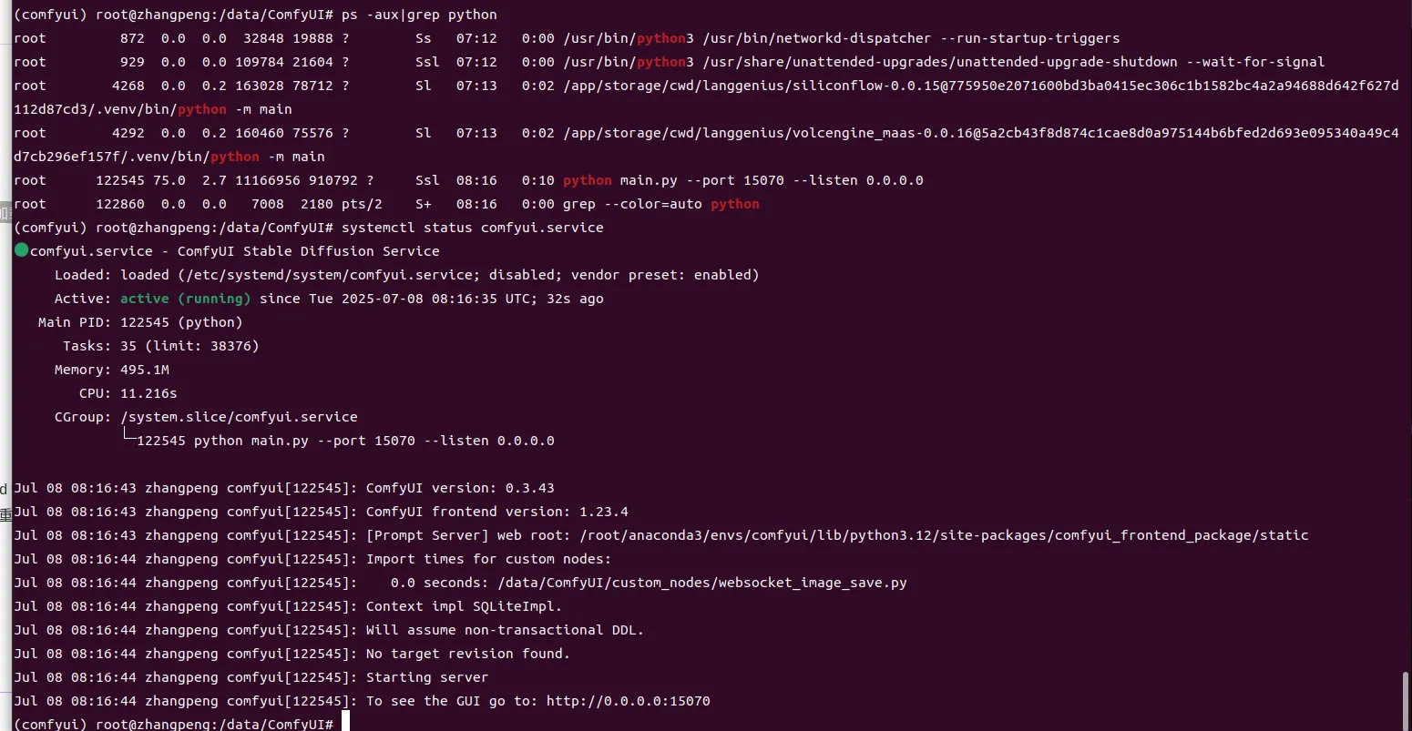 ExecStart=/bin/bash -c 'source /root/anaconda3/etc/profile.d/conda.sh && conda activate comfyui && exec python main.py --port 15070 --listen 0.0.0.0'
