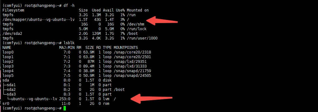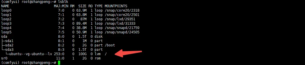 lsblk我在创建VM实例的时候明明分配了1.5T这里的根/默认的只有100G,需要处理一下(估计后续1.5T也不够需要扩容磁盘):