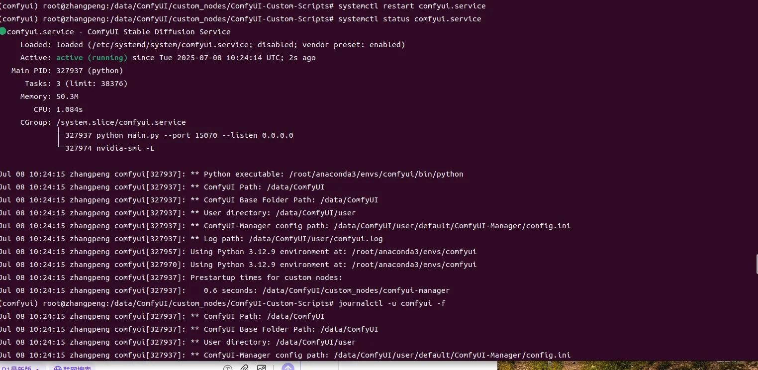 每次使用命令启动comfyui的方式很不方便对服务的管理与维护,现在我们将comfyui注册为系统服务,通过systemctl管理comfyui:
