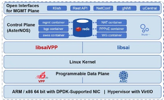AsterNOS-VPP | VPP数据平面整合 + SAI扩展,支持DPU/服务器平台 | 替代传统黑盒路由器(如ET2500智能网关) |