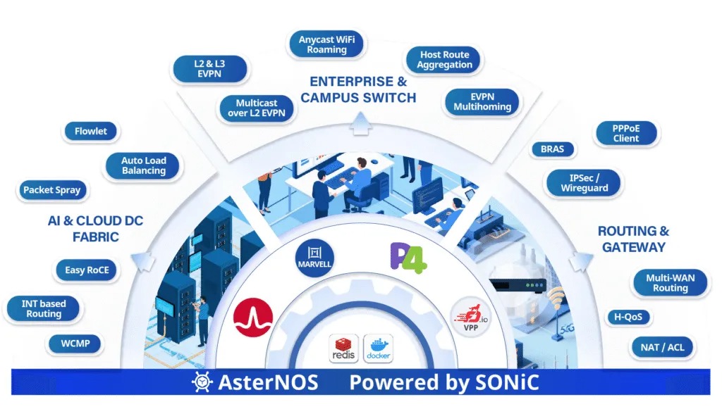 AsterNOS-Campus | 轻量化移植(支持1G接入交换机)+ MPLS/PTP + OpenWiFi集成 | 首款企业级SONiC园区方案 |