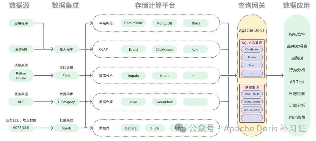 Apache Doris 具备对标 Presto/Trino 的联邦查询 Catalog 能力,当前可实现与数据湖产品、OLAP数据库产品、OLTP数据库产品以及ES、阿里云部分云产品的联邦查询能力,在 JBDC-Catalog、Hive-Catalog 联邦场景中,还可以实现数据查询回写的能力,该能力可大幅度降低构建异源数据库统一查询网关的复杂度,可根据业务场景需要来设计不同的应用思路。