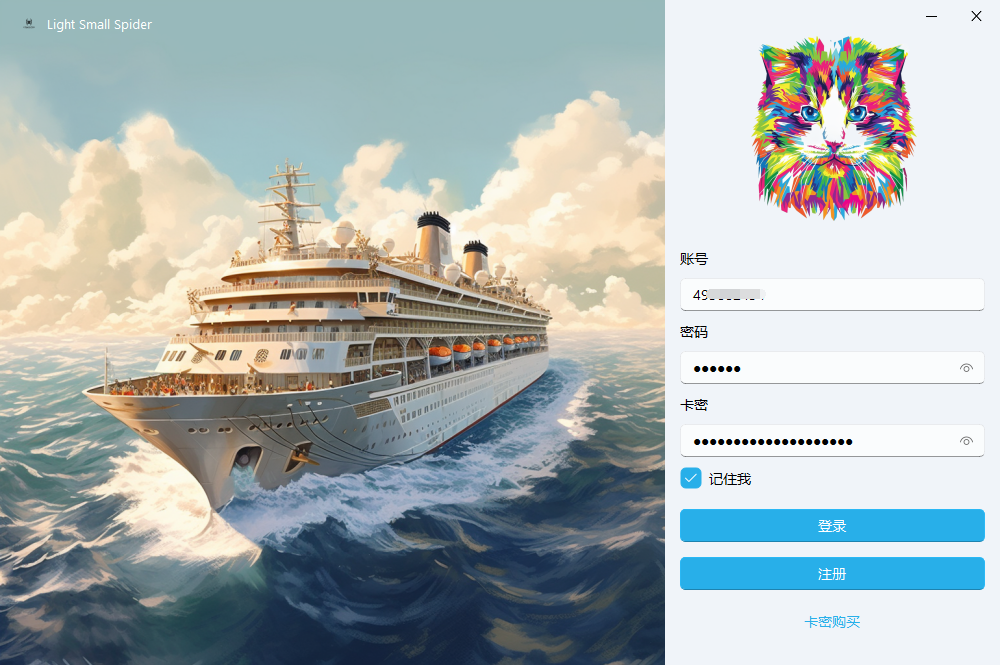 第一次登录,请先点击【注册】按钮,注册完之后,就有了账号和密码。然后点击下方的【卡密购买】按钮,选择适合自己的收费方式,获取卡密。