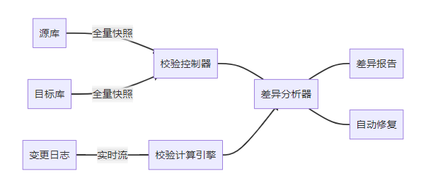 图说明: 双管齐下的校验体系:1)全量校验:周期性快照比对 2)增量校验:实时追踪变更。校验控制器协调校验任务,差异分析器识别不一致记录,自动修复模块处理可修复差异。