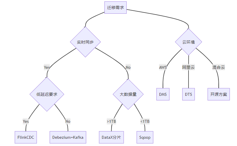 图解: 该决策树根据迁移场景的核心特征提供工具选择路径。实时场景优先考虑FlinkCDC和Debezium组合;批量场景根据数据量选择工具;云环境可直接使用托管服务。混合云架构建议采用开源方案保持灵活性。