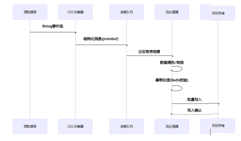 图解: 现代增量同步架构核心链路由五部分组成:1)数据库变更捕获 2)消息中间件解耦 3)流处理引擎 4)数据转换层 5)目标存储。关键在于通过消息队列实现生产消费解耦,利用流处理实现转换逻辑,并通过幂等机制保障Exactly-Once语义。