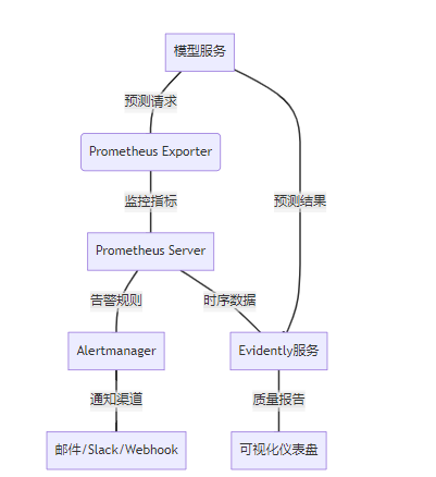 图解:系统采用双引擎架构,Prometheus负责基础监控指标采集与告警触发,Evidently执行深度模型分析,两者通过时序数据关联实现精准问题定位。